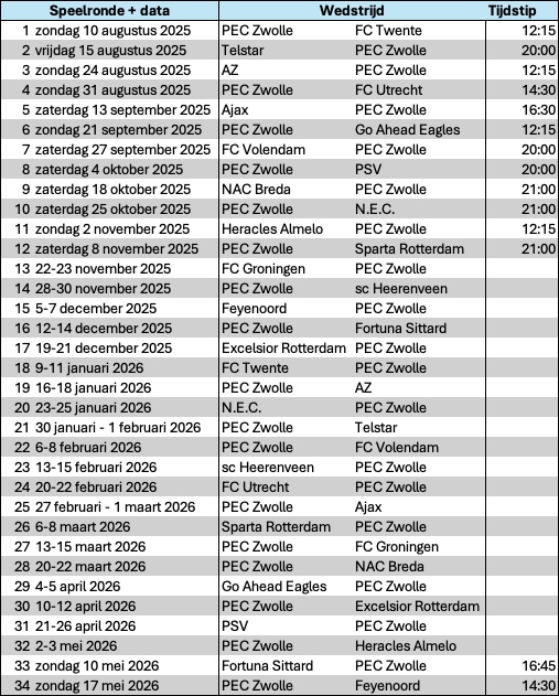 Met de geplande eerste training aanstaande zondag, staan we toch alweer aan de vooravond van het nieuwe voetbalseizoen. In het verlengde daarvan is vanmorgen om 09:00 het speelschema voor aankomend seizoen bekend geworden. Deze is onderstaand te bekijken voor PEC Zwolle. Naar welke wedstrijd of awayday kijken jullie het meeste uit?